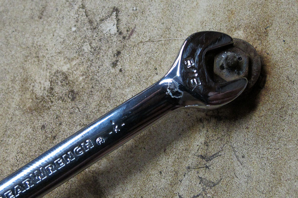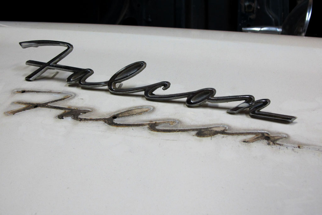 I got the Falcon emblems off the front fenders to clean up both them and the fender. Having taken a friend’s off just the other week, I didn’t expect there to be anything holding them on. Just in case, I checked – and sure enough there weren’t. I began prying the emblem off of the opposite fender which I hadn’t checked under – and it didn’t want to budge, in fact I made a little crack in trying. Then I stopped, deciding I’d better add some Liquid Wrench to the back. I did that on the opposite one, which I’d already turned over. Then I tried prying that one, and it came right off.