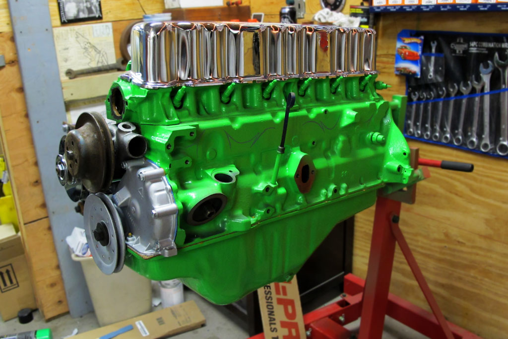 Ethan also did most of the final assembly of the engine today – tomorrow he’ll attach the transmission before we drop it in. The fan pulley off of the old engine is being transplanted and still needs painted, although I kind of prefer it rusty…that’s just the hillbilly in me I guess!