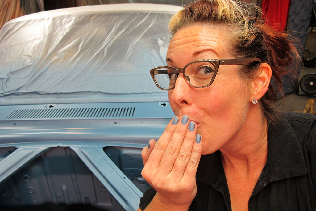 I sanded the few rough spots with 320 grit and feathered them out slightly – then it was back to painting time! Falcon’s second coat of Suede Metallic Hot Rod Flatz went on tonight. I sprayed first (which didn’t seem as daunting as it did last night,) and Ethan took the gun for the last little bit getting a few hard-to-reach places. It’s nice to be able to work together as a team!