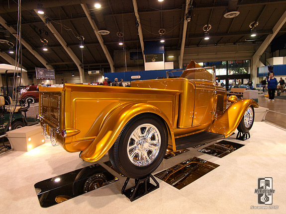 Then check out the only roadster pickup in the crowd, appropriately named, “Goldenrod”. I’ve already read somewhere else where the author said, “Gold isn’t my color”, but it’s mine! I’m trying to figure out colors for my Falcon wagon up on the roof and this gold is sweet. The pictures barely do justice to the stunning appearance under the hall lights and the sunshine in California.