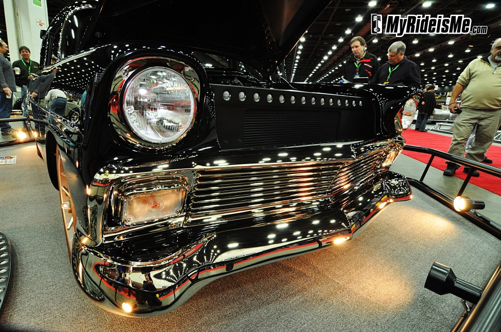 Ron Hall’s Z “O” 55 sat proudly in the front row of the Detroit Autorama. The trick dash and custom grille treatment were outstanding and the colors worked perfectly together. You barely notice the shaved handles and extended fender flange trying to take the whole car in. Why no Ridler? The engine’s covered on this one, and it’s a fairly common LS-1. Compare that to the ZL-1 big block riding in the 55 Chevy the judges did select for the Ridler. Points from me though for hammering gears through a 6-speed Tremec. Hot Rods gotta row gears!