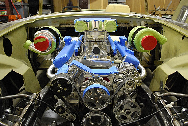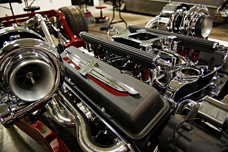 To start out, my brother, Jonathan Peace and I stripped the car down and had it dipped. It had little to no rust in the shell. We put the body on a frame table and from the get-go my brother and I had it in our minds that we were going to build a Ridler car. We set out on that mission from the start: October 18, 2008. As with most projects the car evolved into something more elegant and radical than we could have ever imagined. We built an “organic flowing” frame to which a heavily modified Gale Banks Twin Turbo motor, a Bowler 4L80E transmission, and a Ford 9 inch rear end were all mated.