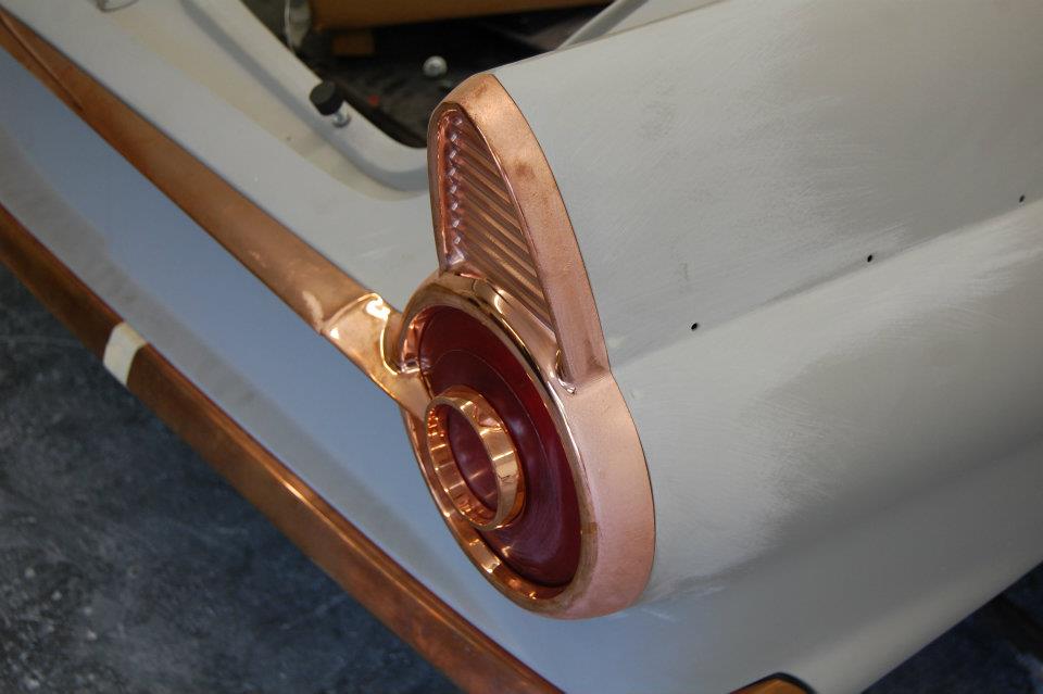 From this point on we enlisted Jesse and Jeff Greening of Greening Auto Company of Nashville, TN to bodywork the smooth metal, fit and gap the panels perfectly, machine custom one-off trim and parts, paint the car, custom build the wheels and steering wheel, and do the wiring. The interior was designed by Jonathan Peace at Torq’d Design Lab and was stitched and wrapped by Paul Atkins of Cullman, AL. All of the chrome plating was done by Steve Tracy of Advanced Plating in Nashville, TN.