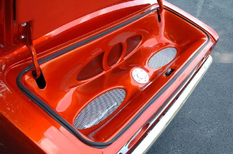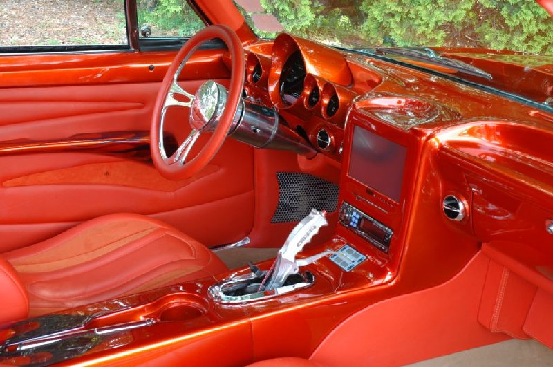 To produce an interior for this car that would be every bit as off the wall as the rest of the car was a challenge for sure, a few yards of crushed velvet and a chain link steering wheel just wouldn’t cut it here. Fortunately the plan for the interior had started at an early stage, while the shell was still on the jig, with a custom console being fabricated in steel that wrapped around the two separate bucket seats in the rear and extended down through the center of the car to meet the dash. Suffice to say, the console was also finished in Tangerine Candy, as is the way-cool ’59 Impala dashboard, now filled with Dakota Digital electronic instruments to blend old design and new technology together in one fell swoop. Incidentally, the screen in the centre of the upper console is an Icon TV Monitor system with full multimedia facility including Sat Nav and full internet access. Also housed here is the Alpine head unit, that together with the Critical Mass amplifiers and woofers hidden beneath the molded panel in the boot kick out approximately 3700 watts of audio power.