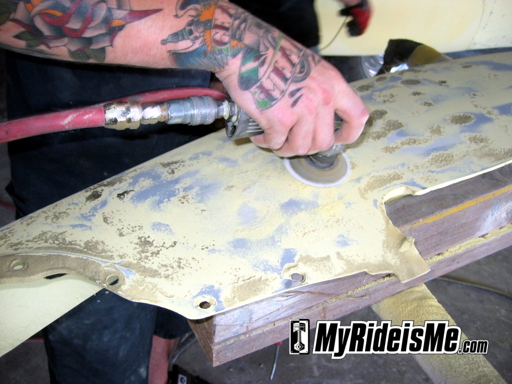 Splash apron for the body work lessonbody work lesson - guide coatBodywork lesson - digging in with the DA sander As you can see, the panel’s already been sprayed with Squeeg’s high build primer. You can also see it’s in pretty bad shape from media blasting. It would be tough to get it back from blasting in this shape, but better to have the loose material come off now then after you’ve painted!
