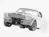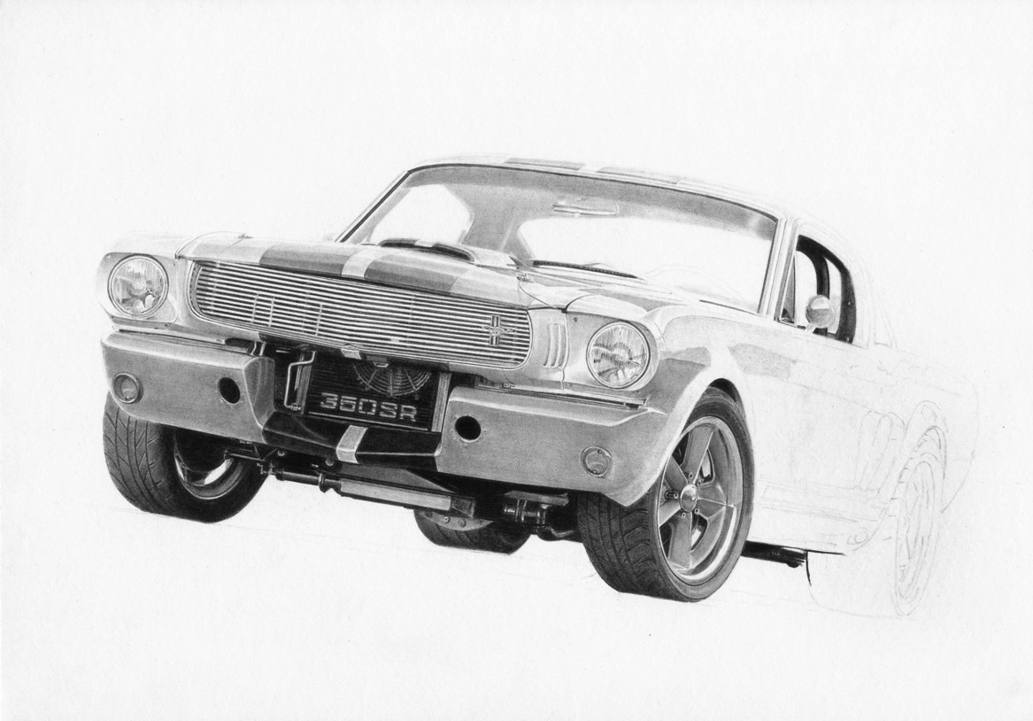I could look at 100s of photographs but to want to make me draw it, It has to be an interesting angle – no side on shots! different cars have their own ‘best side’ I find, and this for me works for the Mustang. Once I have a good quality photo of the subject I then go about sketching roughly the outline, wheels etc with a light pencil (H), this can take a while gradually getting more and more exacting until it looks spot on. I have my own method for very tricky bits like highly detailed wheels but a magician never gives away his secrets…