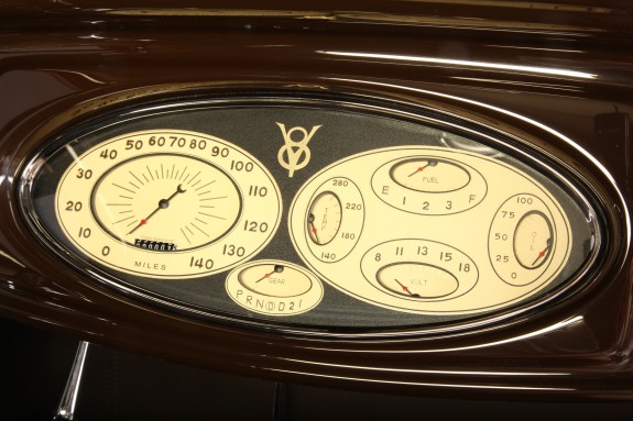 This is the Peace family’s 1955 Ford Thunderbird that won the 2012 Ridler Award. If there’s one word to describe it, it’s CUSTOM. You could also say, “One-off” or even “One of a Kind”. All of those words would accurately describe the cars found in the “Great 8” contending for the Ridler. They’re all amazing- amazingly custom, all the way down to their custom gauges.