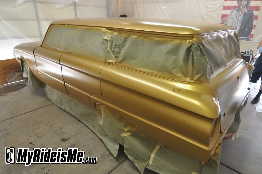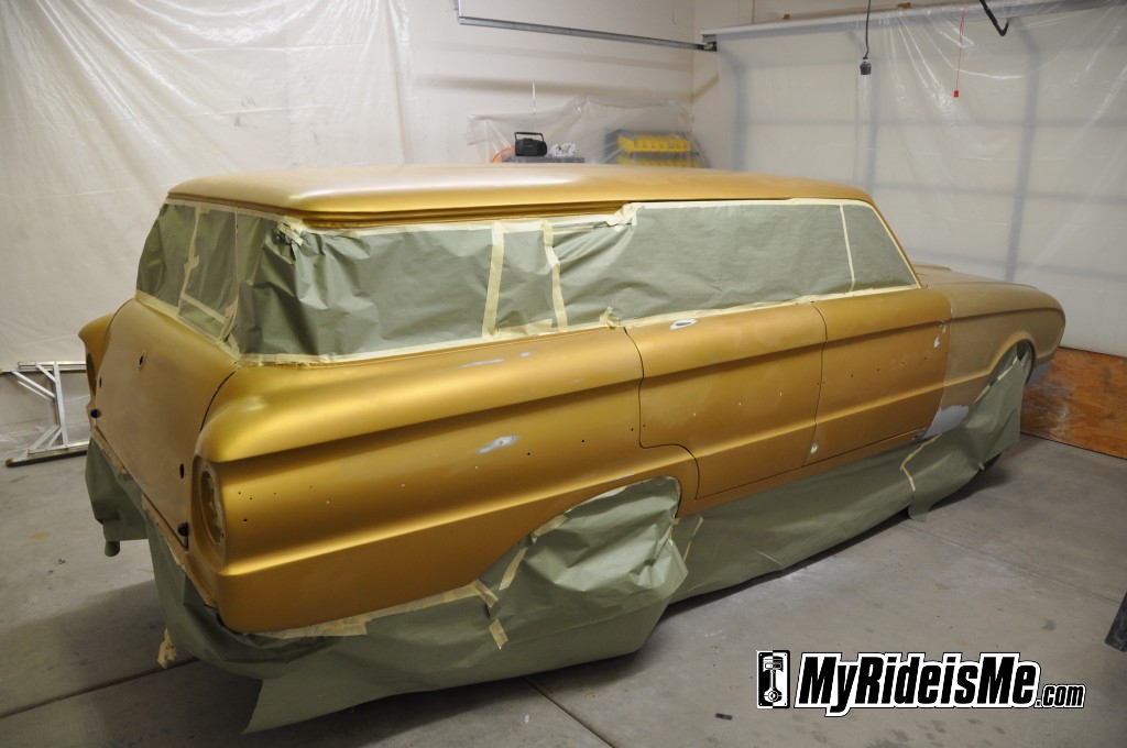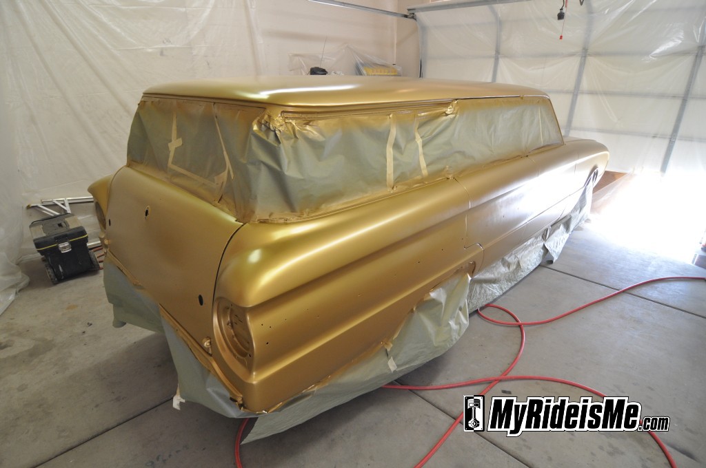 It’s a long story how I got here, you can read it all at this link: Falcon Wagon Build. It started with bodywork lessons and primer from Squeeg’s Kustoms then a paint job gone wrong. Back on track, here’s how my buddy Joel and I laid on this flat gold paint. I think it came out great!