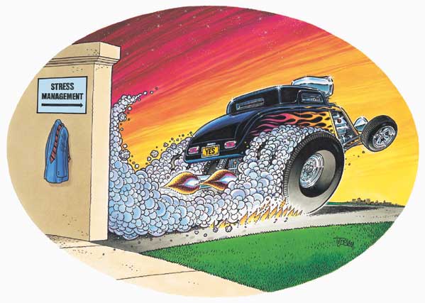 If you have ever been to a large auto swap meet with commercial vendors or flipped through a car catalog that offers automobile collectibles for sale, then you’ve probably seen the art of George Trosley (Troz). Troz started his career the traditional way by attending Hussian School of Commercial Art in Philadelphia, PA. After schooling, he landed several well paying commercial jobs working for various studios. But Troz felt that something was missing in his life. Illustrating commercial products was boring and tedious. Taking a big chance in 1973, he threw it all away to chase his dream of becoming a freelance cartoonist. He soon began drawing for CARtoons magazine where he would later create a couple of the best loved characters of the magazine known as Krass and Bernie. Originally Troz wanted to name them “Crash and Burn” which were the nicknames for his brother and himself growing up. They received the nicknames from all their crazy mini-bike and go-cart stunts.