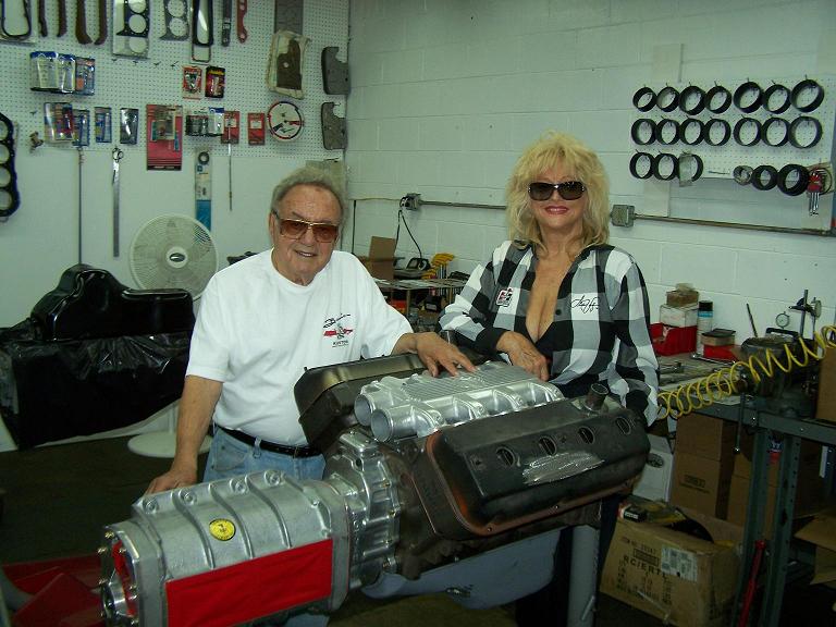 Three legends. Custom car designer George Barris, drag racing personality and Honorary ACAG member Linda Vaughn besides the blown and injected 354 Chrysler Hemi being readied for the Allard Chrysler. (Rocker covers are slaves.)