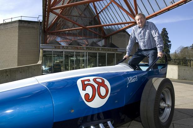 ACAG Patron Nick Mason tries the car for size. (source National Motor Museum, Beaulieu)