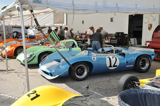 Here in this series of images taken on Friday in the paddock and on the track are a few of the memorable machines in action and on display at this year’s festival. They begin with Tom Malloy’s McLaren and his Eagle followed by a Porsche 917K, a model with a towering presence in historic Sportscar racing. This iconic machine brought Porsche its first 24 hours of Le Mans sports car victory in 1970 and triumphed again in ’71. David Hinton’s Heritage Motorsports of Clearwater, Florida arrived with a remarkable car count of 26 machines. These included a gaggle of acclaimed, rare and lovely Cam-Am race cars ably cared for by the esteemed Billy Foster.