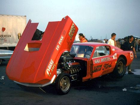 “Here is another of Rodger’s famous ford cammers. This is the Max Curtis 66 long nose mustang. The cammers where getting the job done at the “Pit” in 66-67 until the Ed Pink and Donavan aluminum head hemis started showing up. There were a few strong Big Block Chevys to come along but the next few days we will see the Ford’s that ruled (for a time).”