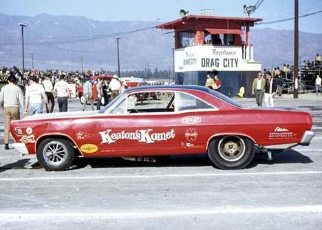 Okay, one last Comet. This guy we all liked. Sooo, it is not a Vomit Comit. Dee was a great racer who let us “Kids” help unload the car, wax the body, clean the tires and what not. A few of us even got to climb in and sit in the beast. He didn’t win much, but I remember one night he kicked butt and took names (must have upped the nitro % and prayed to the Piston Rod and Crank Gods because it held together). The car was a “hand-me-down” from Pete Gates but Dee made it his own with an awesome Red, White and Blue pearl paint job. Dee Keaton with the Keaton’s Komet ! He campained a Cougar “Keaton’s Kougar” in 68 and then faded away, but not in our memories. He was a cool dude as compared to guys like “Big John” Masmanian who would yell at us for even going near his car. A game we played when bored was to see who could put a finger print on the “Big’s” Cuda. Notice the aluminum body dents in the fender, identifying this car as one of the original FoMoCo sponsored Comets (fiberglass does not bend).