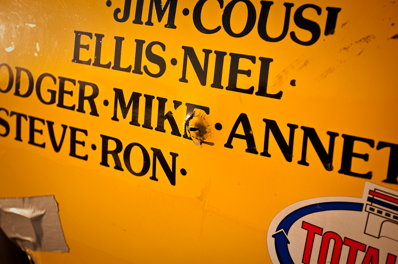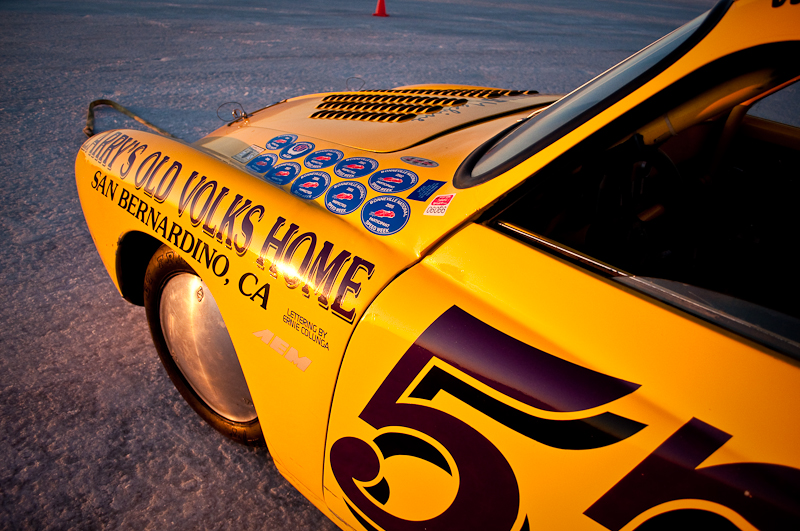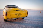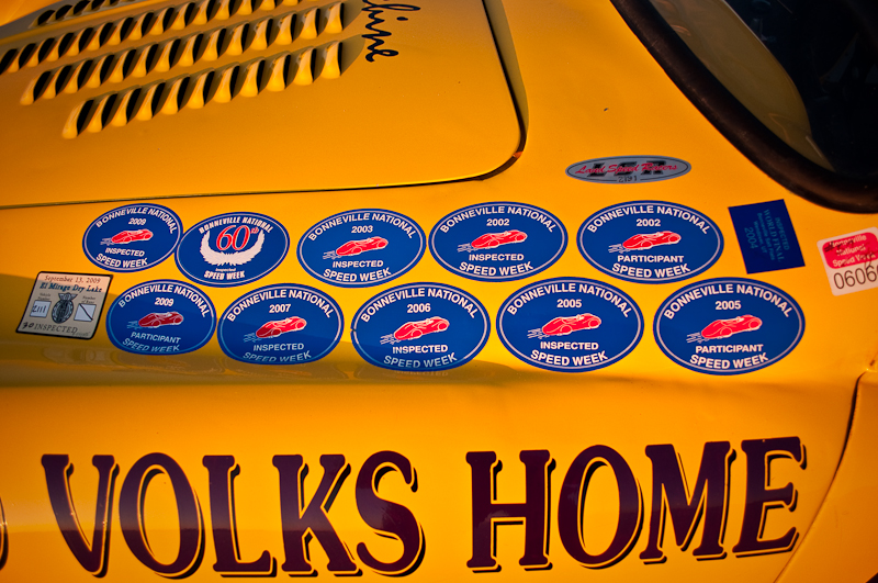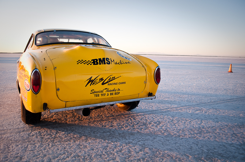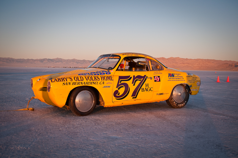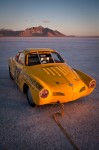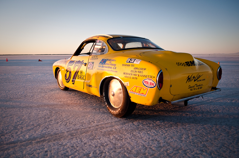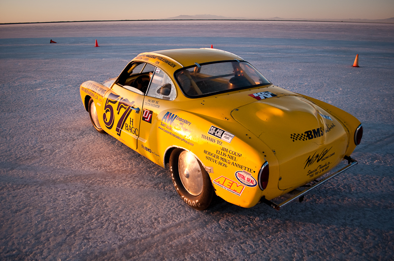 I arrived at the Salt for World Finals 2009 right as the sun peaked over the mountains. What a beautiful sight. I pulled up to the start line where there were race cars and bikes waiting to make their record return runs. The first car I walked up to was this bright yellow VW Karmann Ghia owned by Larry Monreal from San Bernardino. I asked the gentleman standing next to the car if he was Larry, and he responded that no, he was Jim, Larry’s friend and driver. As with any Bonneville Salt Flats land speed race car and team, there is always a big, long and interesting story. No long stories today, but I do want to share some details I learned by spending a few minutes with Jim that I hope will display what dedicated hot rodders and land speed racers these guys are.