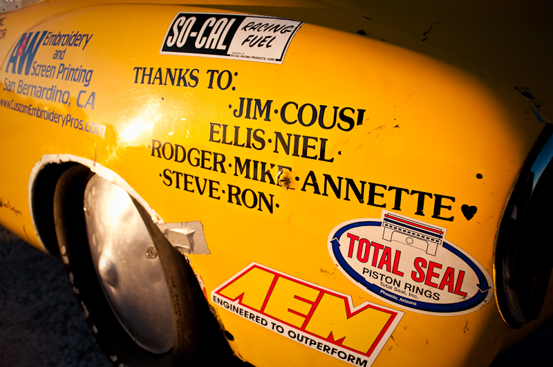 This yellow Ghia, as you can see from the Bonneville stickers on the fender, has been coming out since at least 2002. There’s also an El Mirage decal or two. Larry is 82 years old now and lives for this stuff says Jim. Larry has a degenerative eye condition and has had some surgeries already. His eyesight is such that he can’t drive anymore. But Larry spends the off season prepping the car and getting ready to run.