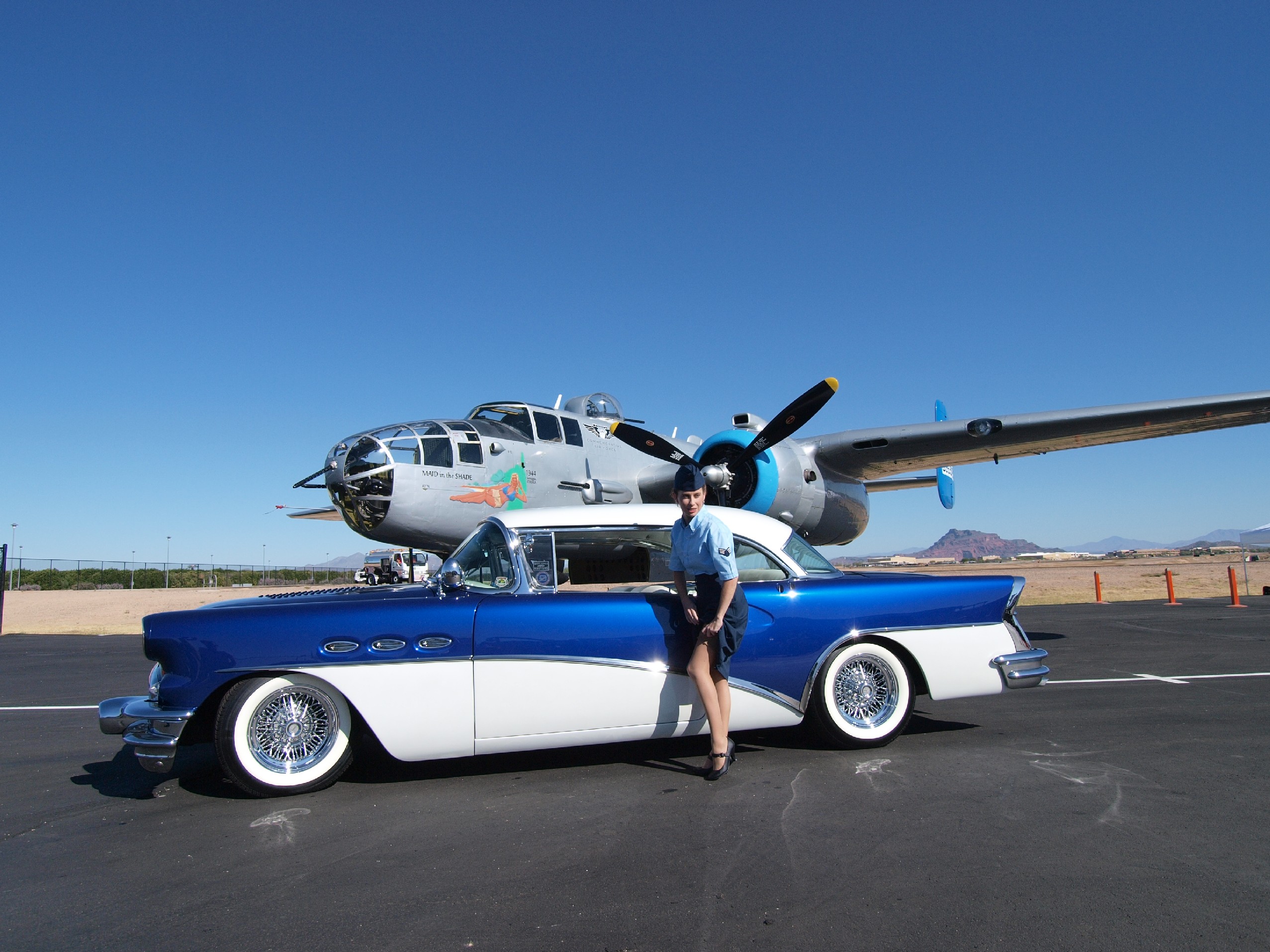 Warbirds on display for the car show include the B-17 Sentimental Journey, B-25 Mitchell Bomber, North American SNJ/T-6 and Stearman trainers, and many more. Exhibits displays Include a tribute to the B-17 Chow Hound, honoring fallen Airmen and the 91st Bomb Group, the Tuskegee Airmen, the Flying Tigers, the China Burma India Theater and Women in Aviation, including the Women’s Air Force Service Pilots (WASPS) of WWII plus others.