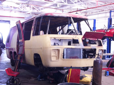“The motorhome started out as your run-of-the-mill GMC motorhome,” says Palmer. The GMC was built from 1973 to 1978 and is the only motorhome ever manufactured for public purchase by a major automobile manufacturer. “They are cool machines and a natural for this project.”