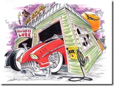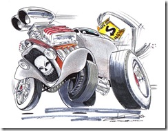 ….sometimes I pull them right out of a magazine..seriously..yet sometimes I just want to draw a particular “specimen” so I’ll google some pics for reference and go from there, but I always put my own spin on them… Once I had an editor call me and tell me that he had 2 features in an upcoming issue: a shoebox and a willys prostreet… Would I be able to get the artwork together in time to go along with the actual pics of the cars for that issue? What kind of time do i have?” I asked. “4 days” was his response. I got 2 ref pics of each to go by, that was it, and the end result was Feb. 08 issue of Rodder’s Digest with the illustration called “Shoebox-Willy”. The editor was tickled! He never had an artist smash something out in 4 days.. no egos here, get it DONE..page time is page time.