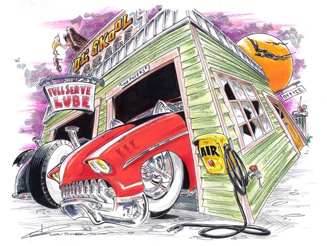 Car-toons first bit me with the magazine, but the first artist that REALLY bit me was Lance Sorchick..this kat has some killer flow..lines always dynamic always deliberate..always “zooming”..like his stuff, but won’t copy his flow, dig?…I have done piles of “formal” renderings like the kind you find with Chip Foose..but it ain’t often that your average guy off the street can afford a 1500 plus rendering. So I do this dress down “fun” style where real people can afford ORIGINAL art..not a poster, not a likeness..but the REAL DEAL. This “car-toon” style allows me to do just that..I want to be the guy that draws for real people..there are no egos here, egos get left at the door in “my house”..if you have an ego that needs feeding?, I may not be the artist you’re looking for, but not just “car-toons” flow out of my studio. I also have my fingers inside of 5 different kulture clothing lines, my own 669 line of shirts as well as piles of tattoo flash..ya, you heard right…tattoo flash..ever want a 1-off tattoo just for you?..hit me up or even find my compilations @ kingpin tattoo. 3 artist flash books out as well through kingpin and poster bomb. I have also had the pleasure of working with Hasbro toys, Gennie shifter/Streamline Hot Rods and the U. S. gov’t (which is all classified, sorry) doing conceptual artwork for their applications. so nope, not just “car-toons”…
