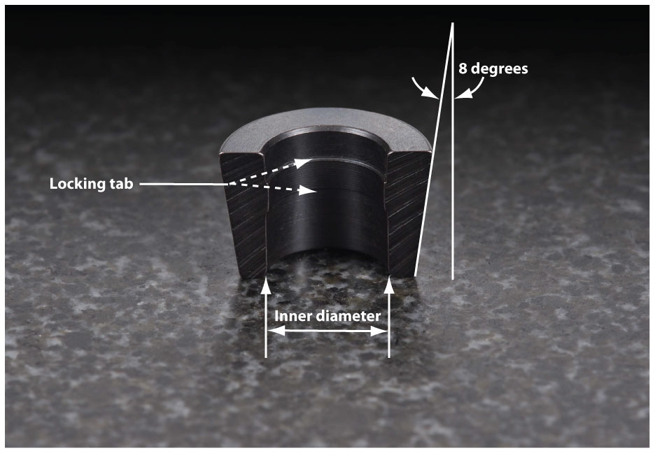 The locking tab fits into the keeper groove. Commonly O.D. tapers vary from 7 to 10-degrees.