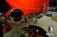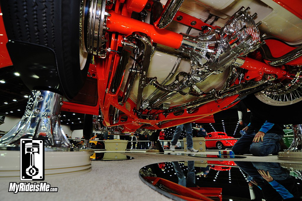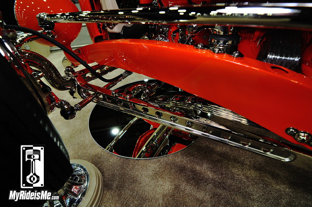 Besides all the blinding chrome, take a look at the oil pan. That’s the sway bar built right in making the engine part of the suspension! Then you’ll see how the quarter elliptical spring tuck neatly into the frame rails. With every fastener polished and the 312 mill smoothed, painted and shined to match the body work, the underside and front of this hot rod is second to none.
