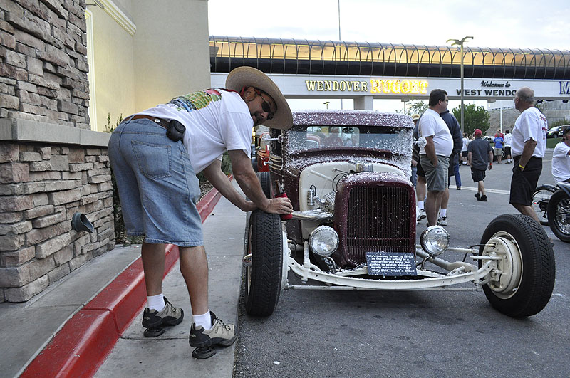 One piece of the Bonneville Speedweek recipe that can’t be forgetten is the get together on Friday and Saturday night at the Golden Nugget in Wendover. From a Salt insider, the Nugget Car Show is not an official car show. You won’t find any websites announcing the Car Show, but it just sort of happens. It has become a tradition. Enter Jerry Armijo and his 1933 Ford Pick up hot rod.