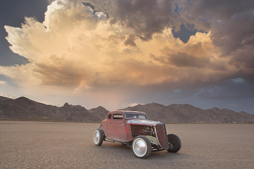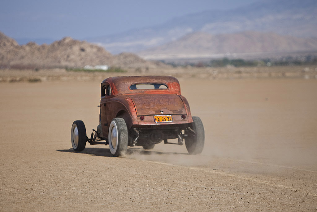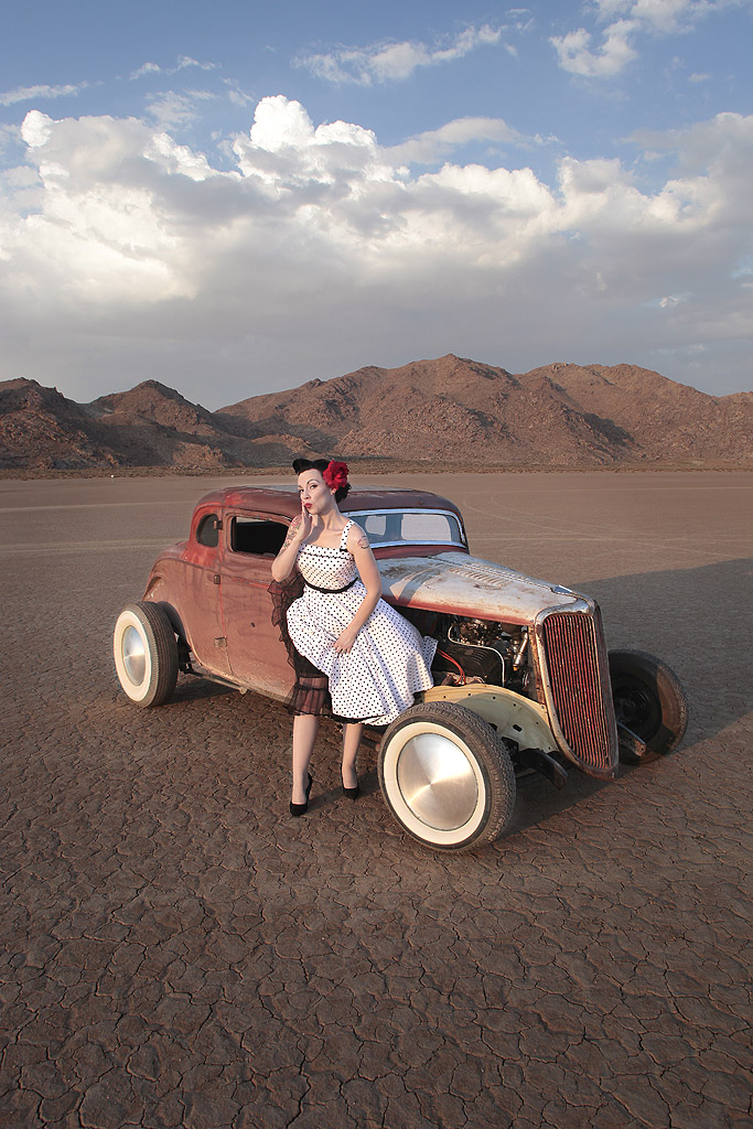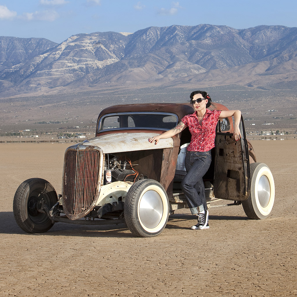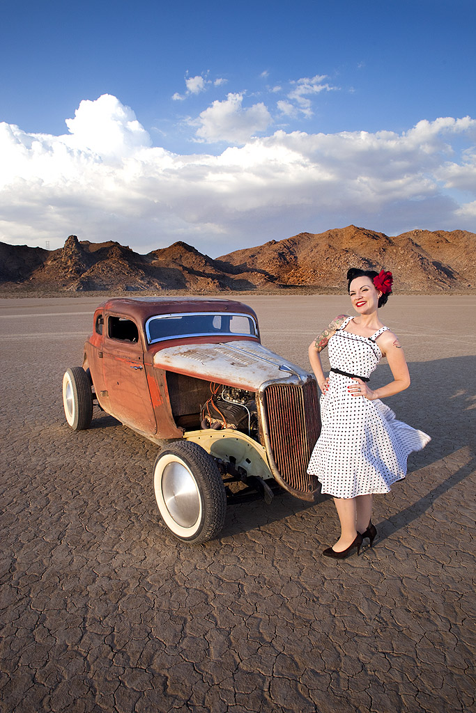 We first spotted this ’34 ford at the Antique Nationals. There she was sitting in the staging lanes waiting to race with the rest of the antique American iron. A picture was snapped at the Antique Nationals. One thing led to another, and there we were a few weeks later in the blistering heat on a dry lake bed doing a photo shoot.