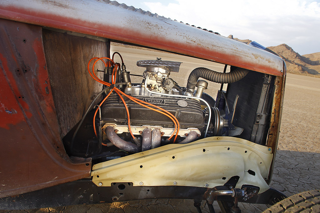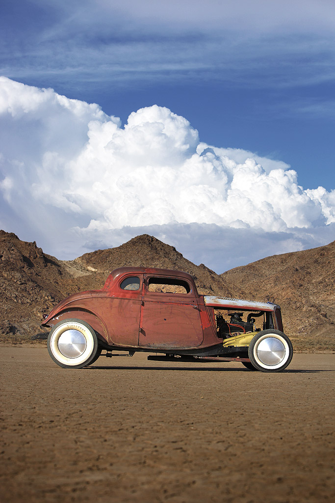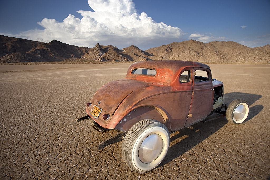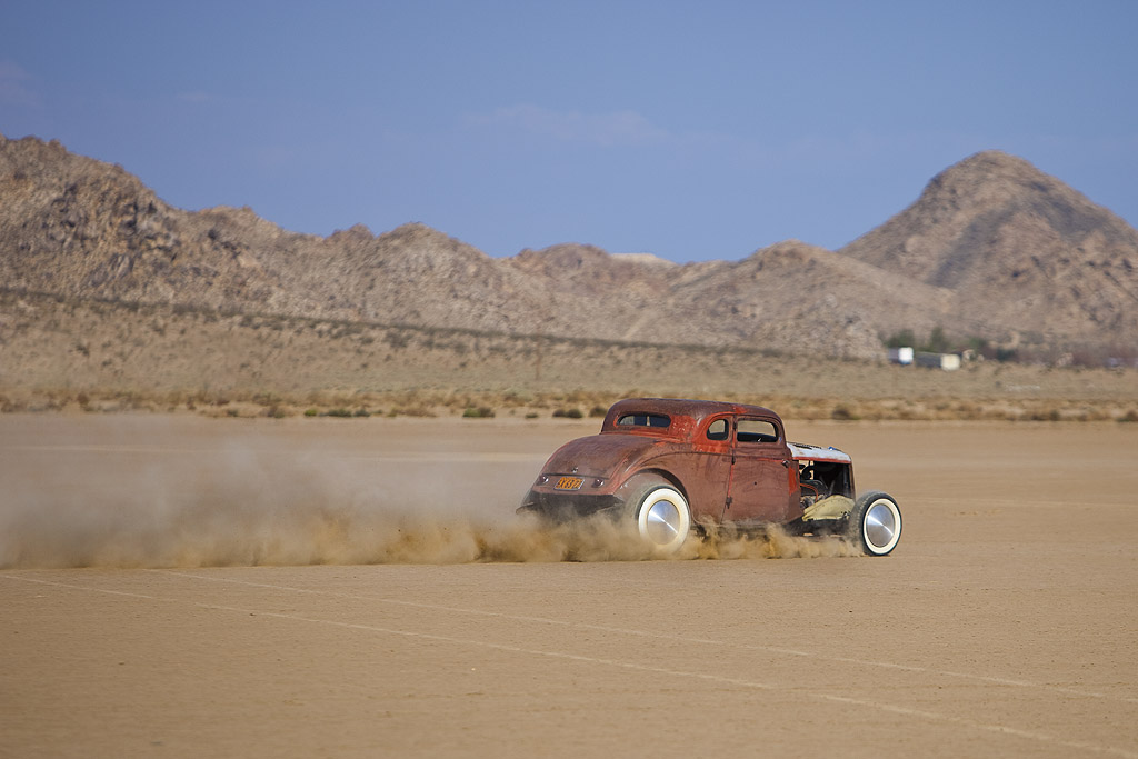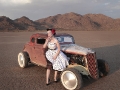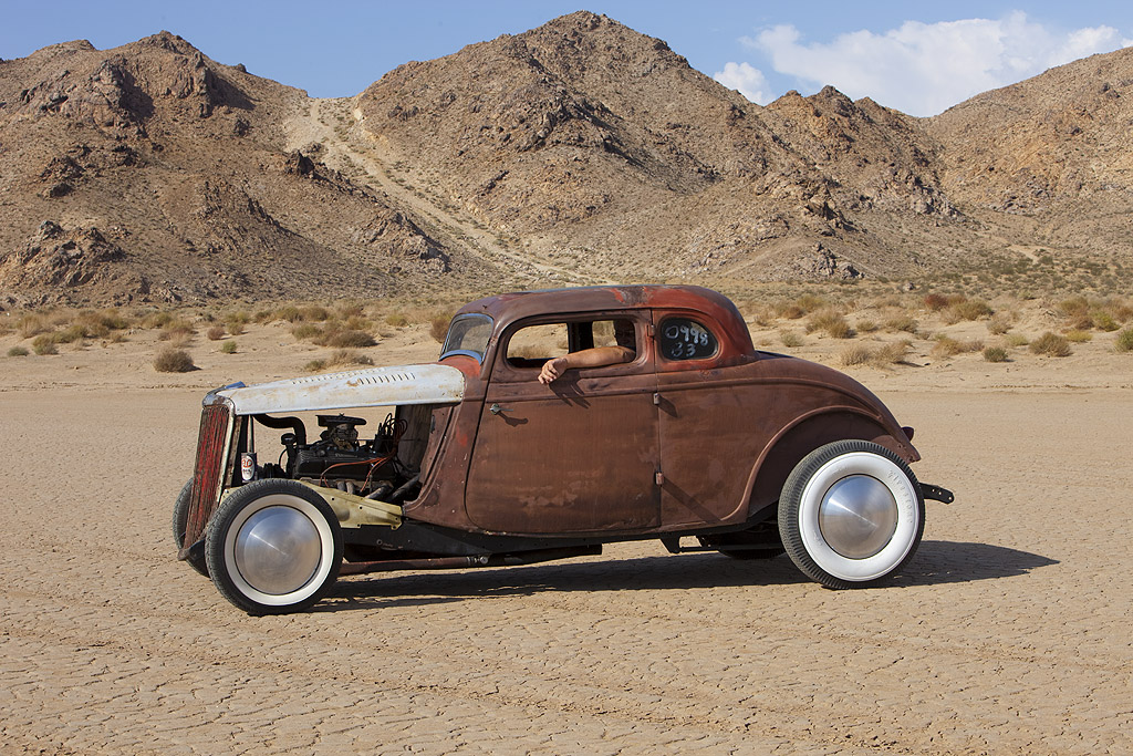 We first spotted this ’34 ford at the Antique Nationals. There she was sitting in the staging lanes waiting to race with the rest of the antique American iron. A picture was snapped at the Antique Nationals. One thing led to another, and there we were a few weeks later in the blistering heat on a dry lake bed doing a photo shoot.