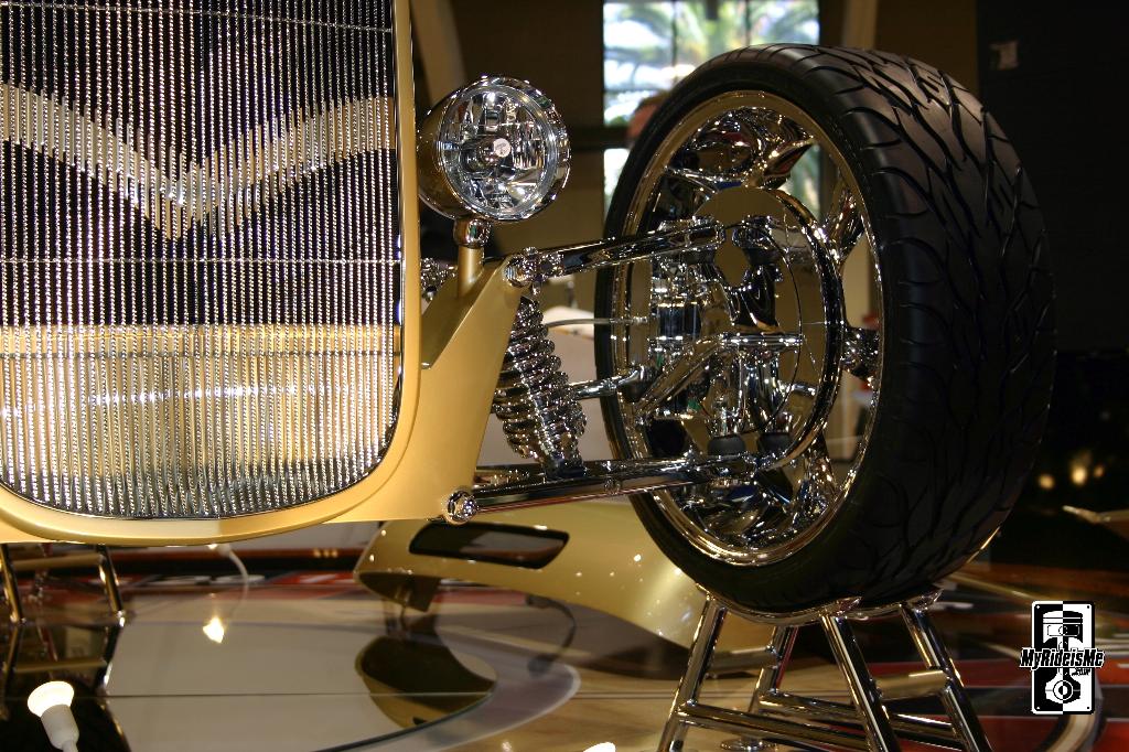 What do you notice? Amazing polish work? Tires sparkling clean? Polished brake rotors…. what? If it rolled forward, how did it stop to roll backwards without scratching? Ah… who cares! Dig that grill! It looked like cut diamonds the way it caught the light. More than one Oscar nominee will consider wearing this grill with their Versace gown. The builder of this car, Scott’s Hot Rods and Customs also from Cali pulled out all stops and left nothing unpolished. Looking at this car from any angle, there wasn’t one piece on this car that didn’t shine. Check out the back.