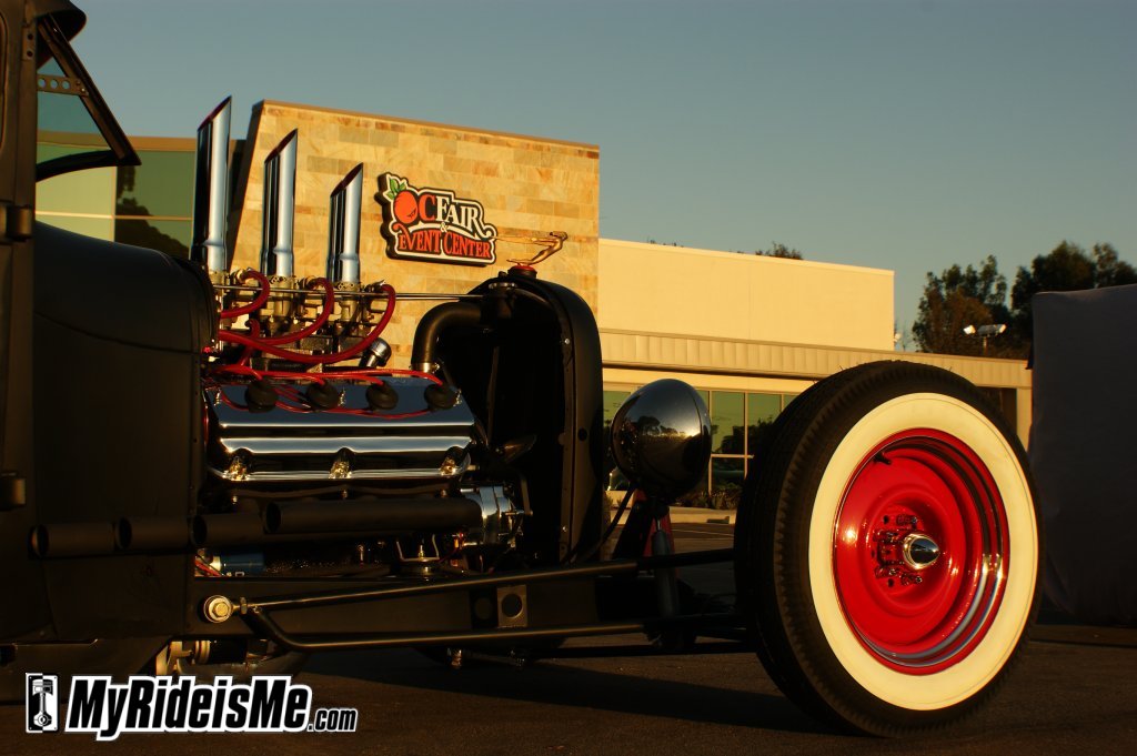 This cool coupe was staged outside the OC Fair on Friday before the show. Guys that had been to "Crusin for a Cure" before know that it fills up fast and early on Saturday so it's best to be early or better yet, get there the night before. White walls on red steelies with a triple-carbed hemi. Hard to go wrong there.