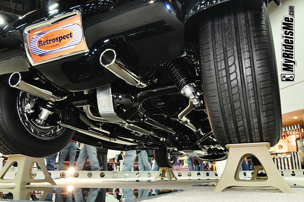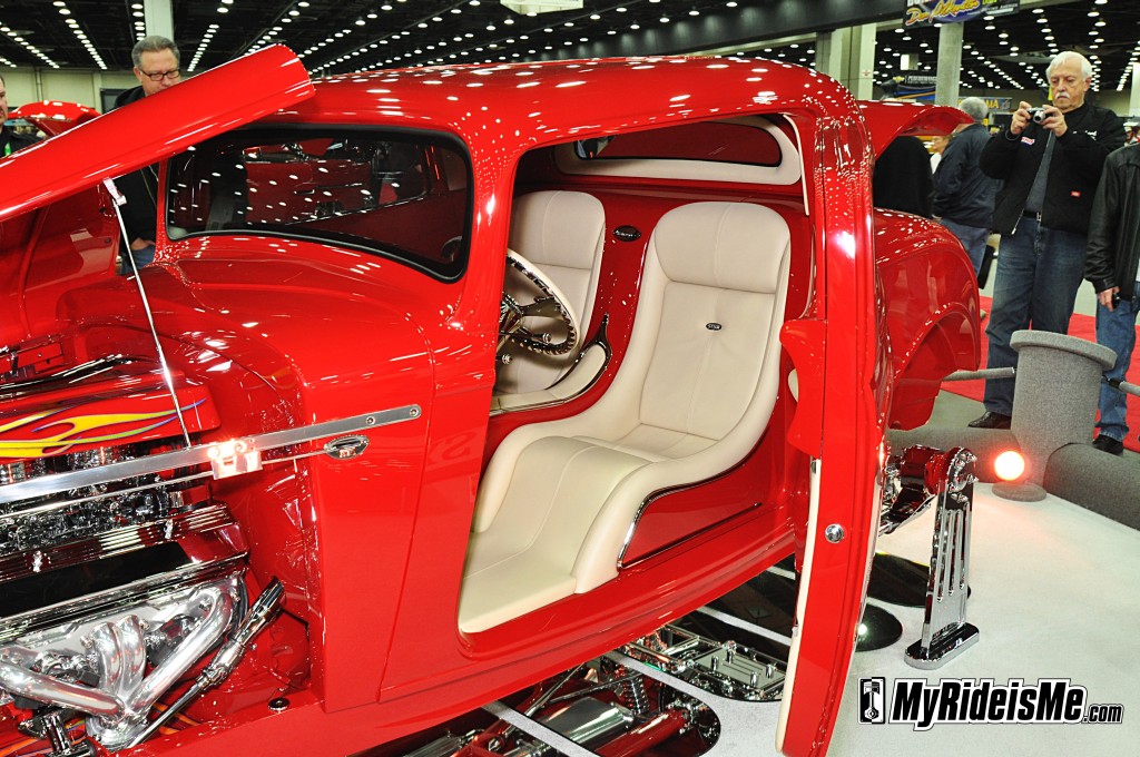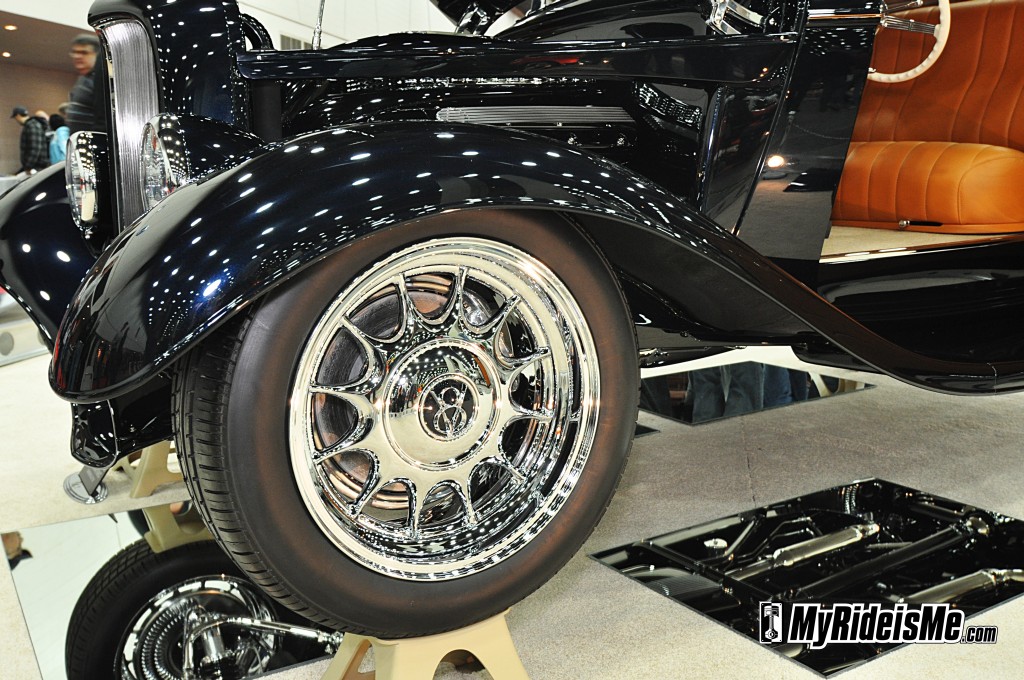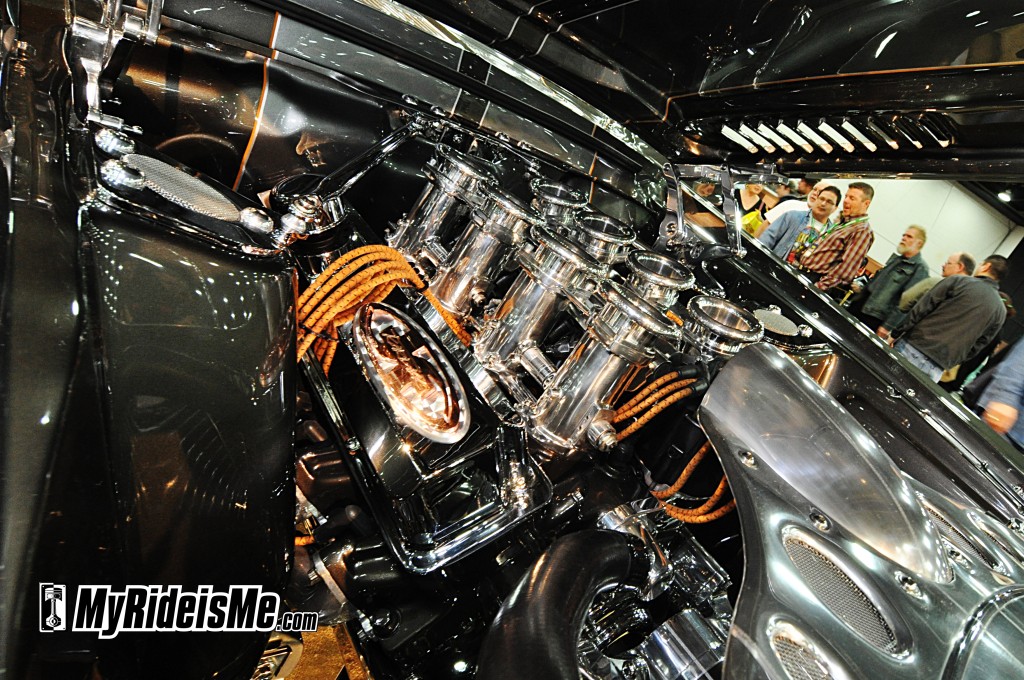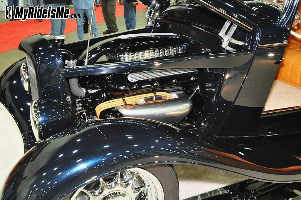 Wicked stance. That and tons of “XS Cash” are what it takes to build a 1932 Ford Coupe to Ridler standards. This sinister stanced 1932 highboy is owned and built by Dave and Joyce Emery of Rochester Hills, MI. I flipped through the build book and found more custom details than imaginable. Try over 300 custom fasteners and covers to make even the spark plugs shine and dazzle! Then, four unique hundred dollar bills were used on the custom gauge faces by Classic Instrument. This deuce is definitely a contender!