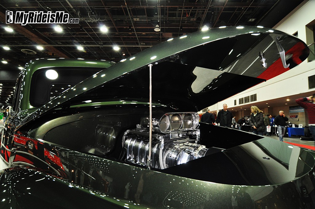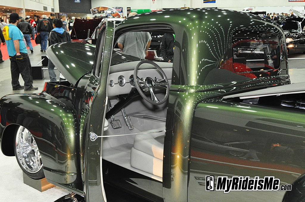 Making their way from the great northwest in Prineville, OR, owners Robert and Nancy put some GO in their show truck: How about 1100 horsepower thumping out of a blown 540 cu. in Dart Motor? Hooked to a 4L80E, I can pretty much describe the rest of this slick green Chevy as, “Custom”. RK Restorations handled the build and paint comes from Charley Hutton. You remember his name from the Boyd show, but he’s been on his own forever now painting with PPG.