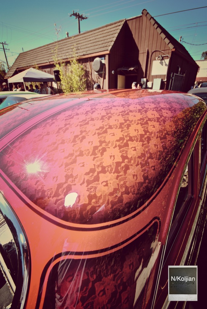 Once inside, you walk through the Polynesian paradise… Grab yourself a Tahitian treat and head out to the courtyard surrounded by a bamboo fence where a list of DJs spun groovy sounds. You exit the small court yard into the back parking lot where you’re met by a 30 foot tiki outside the mai tai bar. Strategically placed rods were around the gigantic tiki. In the court yard, there was some classic Caddys and choice 59′ 4 door Bel Air. The Windsor Deluxe blew my mind how clean it was and the 52 shoebox with some spectacular paint was just as amazing.