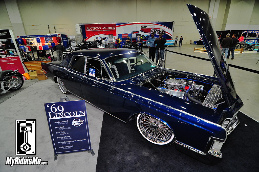 Wrapping up the faves is this pair. The metal flake and flames make the Chevy and easy choice. The Continental I picked based on length! Look at it! Laid out on Dayton wires with a stout 460 under the hood, Baker College put together a winner. If this fits into your garage, you’re a lucky man!