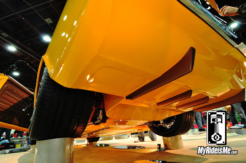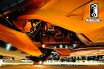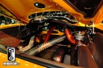 The exhaust pipes are siamesed together to form one bigger pipe to feed bother turbos equally. That’s the only thing you see from below, if you don’t count the tricked out oil pan (there’s a picture below) and custom-smoothed transmission. Most show cars at this level have a detailed under body, but this is unreal!