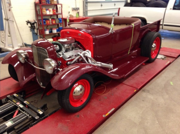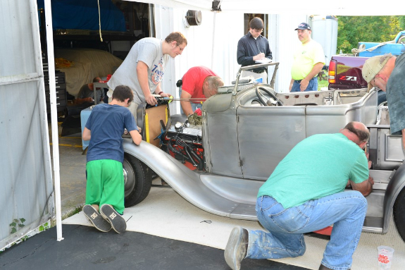 But here they were, a whole batch of kids who appeared to know exactly what they were doing making the final prep on a really wild looking roadster pickup that had the craziest set of pipes sticking out of each side of the engine bay I had ever seen.