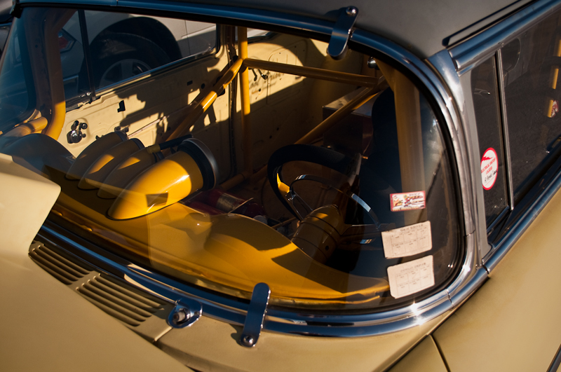 Yellow cockpitCheck out that yellow dash and roll cage.  An unusual color choice, but it looks great.  I love the classic dash from the 50’s.  Still has the horn ring on the steering wheel.  Tons of details on these racecars…look at that front windshield bracket.  Don’t need windshields flying off at 172MPH when the car in stock trim probably didn’t go 3 digits.