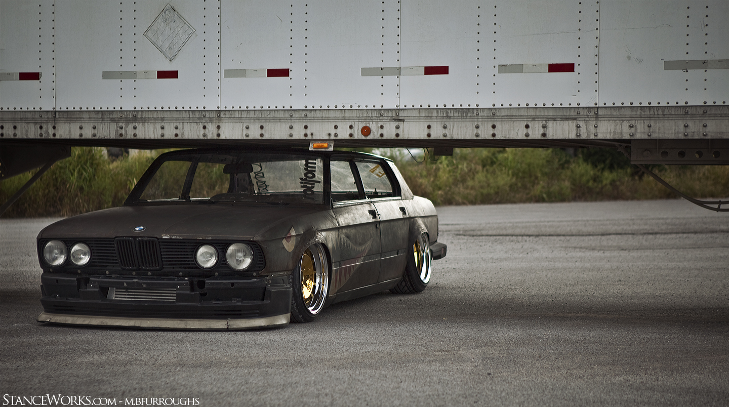 Mike Burroughs is the man behind the website/forum/blog STANCEWORKS, a site dedicated to cars with seriously low stance. Their motto or slogan is “Low is a Lifestyle”. Mike is definitely livin’ low. His 1980’s 5 series BMW you see here is his personal ride, and canvas. If this isn’t My Ride is Me, then I might as well just click Start-Shut Down and go to bed. I’m giving this… this car, the name Bimmer Bomber. Its one of those cars that is meant to stir up people’s opinions. Love it or Hate it, there aren’t many cars around that can piss off so many car guys, while at the same time, making others stand up and applaud. Hmm… sound like the rat rod movement to anyone?