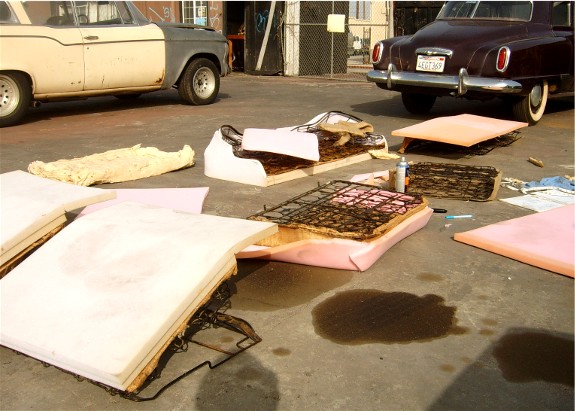 First I tore apart the original upholstery and unlayered the levels of padding. If your upholstery is in good enough shape to use as patterns for next time, be very careful in handling it. Keep all upholstery in solid pieces, using small scissors or a seam ripper to separate each piece. When all this is finished you should have a bare metal frame with springs and other foundational elements attached (many cars may have some sort of burlap/jute underlayer also.)
