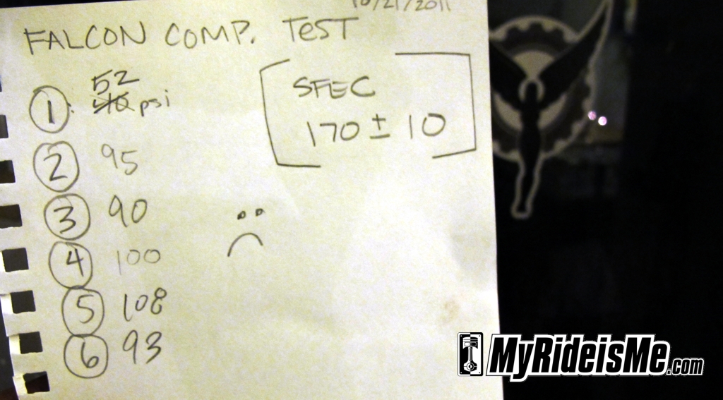 Unfortunately, my Falcon’s compression test didn’t look so good. The 1960 Ford Falcon manual states that the compression of each valve should be 170 +/- 10 psi. As you can see from my notes, my Falcon is WAY off! Cylinder 1 being the worst with a mere 50 psi – not even a third of what it should be. The amazing thing is… this engine still ran! I drove it into my garage!
