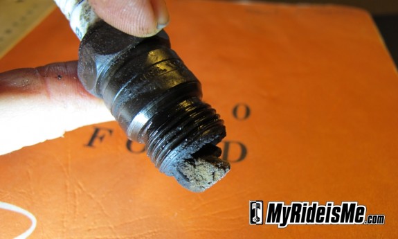 Once the engine was clean, I figured a good place to start was the plugs. Not knowing the history of this engine, I have no idea what’s been done to it! As I pulled the plugs things didn’t look too bad until I got to spark plug #4. Have you ever seen such an ugly looking plug?! It was handy that we’d just covered reading plugs at the last Gasoline Girls meeting – although it wouldn’t take a rocket scientist to tell you that this plug is seriously messed up!