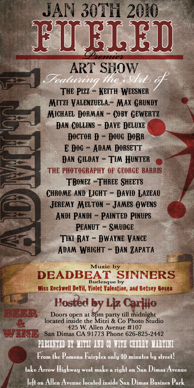 Join us for an evening of Art, Music and Burlesque on Saturday January 30th as Mitzi & Co. along with Cherry Martini bring you Fueled The Art Show. An amazing collection of artwork will be on display and for sale from artists Keith Weesner, The Pizz, Max Grundy, George Barris, Mitzi Valenzuela, Dwayne Vance, Tiki Ray and more.