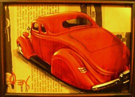 A classic hot rod painted on an old car magazine page by James Owens next to an amazingly intricate ink & paper by Krazy Dotty made entirely out of small dots.