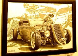 These four pinstriping pieces done on painted metal show of the striping skills of 3 Sheets.