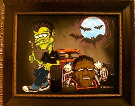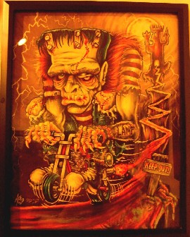 “Social Outkast” Frankenstein by artist duo Johnny Ace & Kali – who studied under the Big Man Ed Roth himself. On the wall, you can see the variety of stuff present – from sculpture to photography to pen & ink to painting.