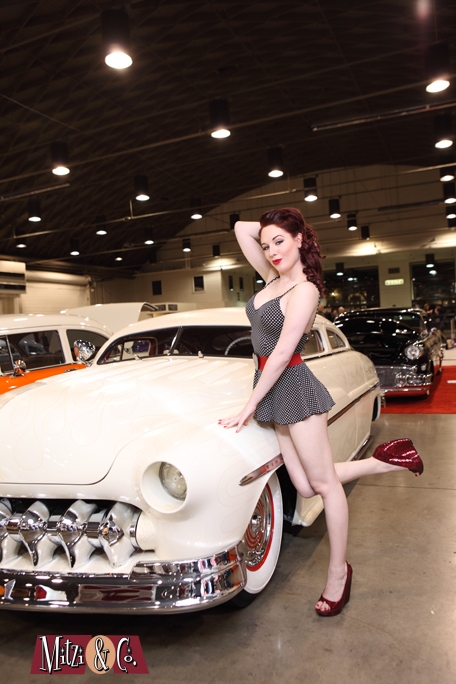 Cruising the Grand National Roadster show and having a great time with my photo partner Swanee, we both stopped in our tracks when we saw the amazingly beautiful Angela Ryan posing next to a super cool laid-out custom owned by Geno Dipol the publisher from Ol’ Skool Rodz. Shortly after we caught our breath and moved through the crowd, we noticed our friend Mitzi shooting the pics. That’s when I knew Angela would be our very next Pinup of the Month. Working with Mitzi is great cause she’s a fantastic photographer (cars and pinups!) and she’s professional and fun to work with at the same time. I’m lucky to have her help with these photos and interview with Angela. Thanks Mitzi! (http://www.MitziandCo.com)