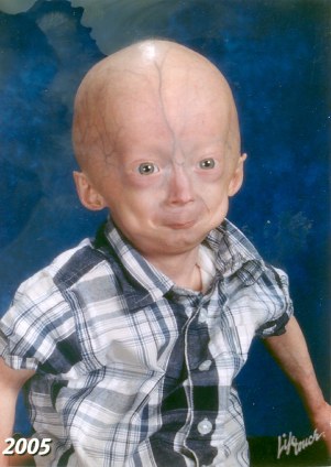 Progeria is a heart breaking genetic condition that makes kids age 7-10 times more rapidly than normal. Children with Progeria rarely live past 16 years old. This is a very rare but fatal condition. The picture on the left is Kristian from Kristian’s Page. The picture is labeled “PreSchool 2005” when Kristian was 3 years old. Kristian died on March 23, 2006.