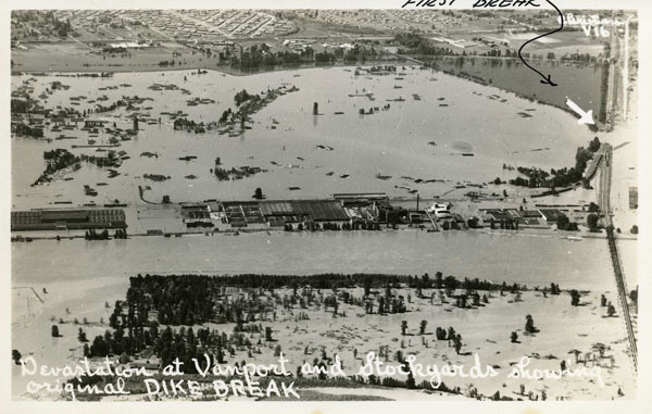 When the war ended, the shipyards shut down and the workers dispersed into Portland – the housing at the yards was not built to last and started falling apart into a slum. Then in 1948, Mother Nature did some urban renewal when the Columbia River flooded and broke the dikes that protected Vanport. It was like New Orleans after Katrina, and the town was literally washed off the map. When the waters receded, only the city streets were left.