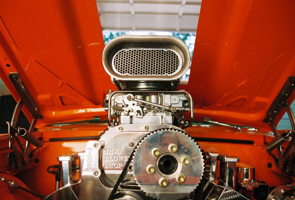 To top off the thumper, a set of GM rectangular port cylinder heads got the full port and polish treatment then bolted down to the stout block. When it came down to getting the induction in order. Jeff knew he wanted a blower that would not only make a statement, but also be capable of sucking in enough air to vacuum ten large homes at once. With this in mind, Jeff picked up a fully polished 8-71 billet piece form The Blower Shop. A pair of hungry Demon 850 cfm double pumper carbs were then used to match up to the hurricane winds that would soon be squeezing into the big block. How much power did all of these parts make together? “This combo with a little more boost, a larger cam, and bigger carburetors made about 1300 hp. So with these smaller carbs and cam, I’m guessing right at about 1000 hp”, speculated Chipman. All of the banshee’s anger is routed through a built Turbo 400 that is loaded with a reverse manual valve body, billet hubs, and Kevlar clutches. There is also a TCI 3,500 rpm stall converter to help get the car out of the hole with haste.